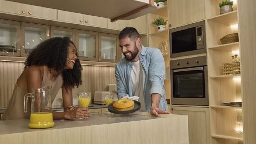 Opte por eletrodomésticos compactos e multifuncionais: produtos como micro-ondas com grill ou fornos combinados podem economizar espaço e manter a estética organizada em cozinhas planejadas, sem comprometer a funcionalidade.