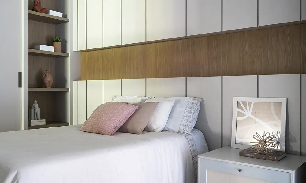 Para que o resultado seja equilibrado, é essencial que o revestimento dialogue com os móveis planejados, considerando cores, texturas e volumes. Aplicações pontuais funcionam melhor, especialmente em dormitórios onde o descanso é prioridade, evitando excessos que podem tornar o ambiente visualmente carregado.