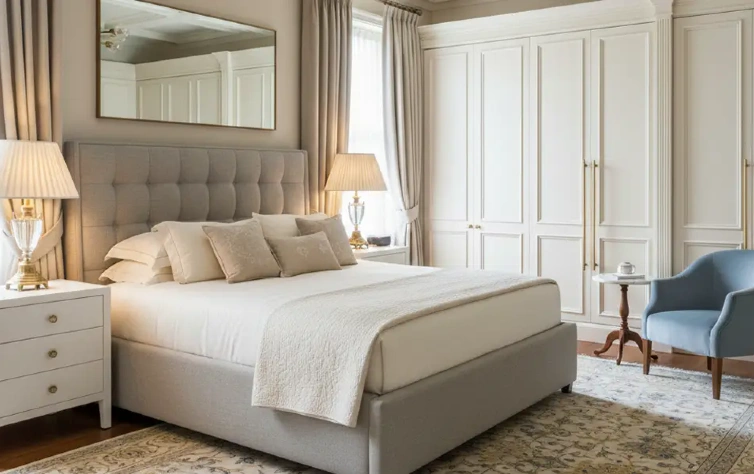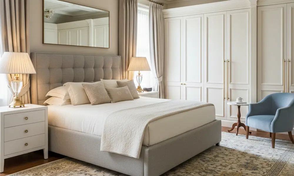 • Em dormitórios de casal, tons neutros, texturas suaves e padrões discretos reforçam a sensação de aconchego e ajudam a criar um ambiente mais propício ao descanso, sem interferir na leitura do mobiliário.